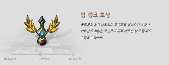 리그오브레전드 2016 시즌 랭크 보상안 (출처=리그오브레전드 홈페이지)랭크 팀에 소속된 상태로 직접 플레이하여 10승을 올린 게이머도 해당 팀의 랭크에 따라 랭크 팀 와드 스킨을 보상으로 받을 수 있다. 게이머가 속한 10승 이상을 기록한 팀 중 가장 티어(포인트 획득 수치)가 높은 팀을 기준으로 보상이 제공되며, 보상 지급이 완료되기 전까지 팀에 속해 있어야 한다.
