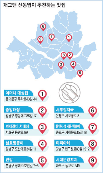 ‘어머니 대성집’ 해장국·수육·육회-‘통인시장’ 기름 떡볶이(오른쪽).■ 연예계 대표미식가, 신동엽의 맛집