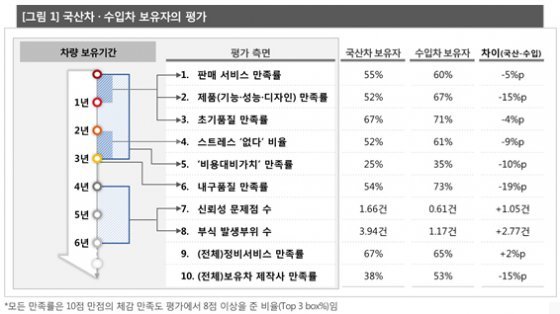 결함, 고장, 문제점을 경험한 초기품질 만족률은 국산이 67%, 수입 71%로 4%p의 차이를 보였다. 구입 후 2~3년 경과한 소비자에게 그 동안 차의 품질과 서비스 때문에 어느 정도 스트레스를 받았는지를 묻는 항목에선 국산차 52%, 수입차 61%가 별로 스트레스를 받지 않았다고 답해 수입차의 스트레스가 적은 것으로 나타났다.