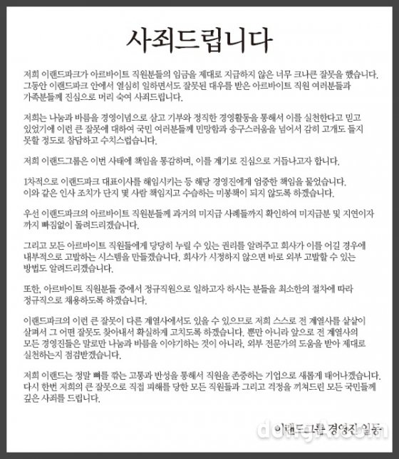 저희 이랜드파크가 아르바이트 직원분들의 임금을 제대로 지급하지 않은 너무 크나큰 잘못을 했습니다. 그동안 이랜드파크 안에서 열심히 일하면서도 잘못된 대우를 받은 아르바이트 직원 여러분들과 가족분들께 진심으로 머리 숙여 사죄드립니다.
