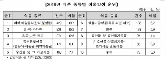 소비자원이 2016년 접수된 식품이물 위해정보 2,181건을 식품종류에 따른 분류별로 분석한 결과, ‘외식·배달음식(한식·분식 등)’ 429건(19.7%), ‘빵·떡·과자류’가 331건(15.2%)으로 이물발생 빈도가 가장 높았다. 이어 ‘음료·다류·커피’ 274건(12.6%), ‘특수용도식품(분유·이유식 등)’ 177건(8.1%) 등의 순으로 나타났다.
