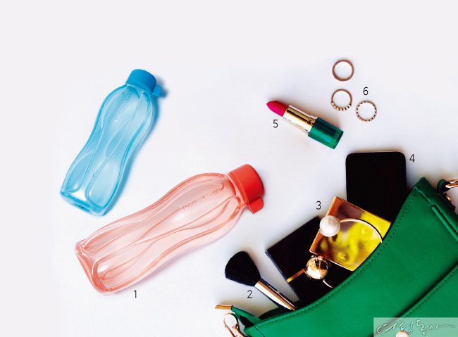 활용도가 높다. 완벽 밀폐를 자랑하며, 뚜껑에 탭이 있어 열고 닫기 편리하다. 운동이나 야외 활동할 때 들고 다니기 좋다. 310ml 2개 2만8백원, 500ml 4개 5만2천원.배우의 가방 속에는 어떤 것이 담겨 있을까?