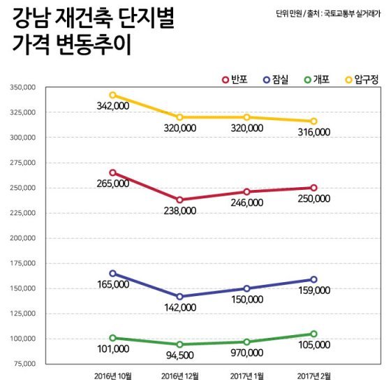 반면 재건축 사업 추진이 지지부진한 압구정 현대아파트는 가격이 하락하거나 보합세를 보이고 있다. 압구정 현대아파트는 주민 찬성률이 30%대에 불과해 연내 사업추진이 불가할 것으로 보인다. 압구정 현대6차 전용 196㎡의 경우 지난해 10월 34억2000만 원에 팔리던 것이 올 초 32억 원으로 하락했고, 지난달엔 31억6000만 원에 매물이 거래됐다. 압구정 현대5차 전용 82㎡도 작년 10월 18억8500만 원에 거래되던 것이 올해 1월 18억9900만 원에 팔려 가격이 크게 오르지 않았다.