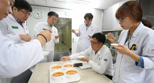 국내 라면 제조 회사들은 근래 인기를 끈 굵은 면발을 이을 새로운 면발의 기준을 찾기 위해 열을 올리고 있다. 농심 연구소 면개발팀 직원들이 개발 중인 면을 시식하고 있다. 농심 제공