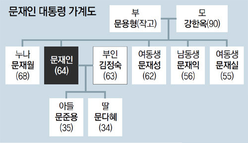 한편 문 대통령의 아들 준용 씨(35)는 현재 국내에 머물며 미디어아티스트로 활동하고 있다. 2007년 2월 건국대 시각디자인학과를 졸업한 문 씨는 한국고용정보원을 퇴직한 뒤 미국 뉴욕의 파슨스 스쿨에서 석사 과정을 마쳤다. 이번 대선에서는 취업 특혜 의혹을 받았다. 딸 다혜 씨(34)는 2010년 3월 부산의 한 성당에서 평범한 직장인이던 지금의 남편과 결혼했다. 문 대통령의 사위는 결혼 직후 미국 로스쿨 입학을 준비했던 것으로 알려졌다.