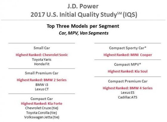 기아차 카덴자(국내명 K7)이번 신차품질조사는 지난해 11월부터 올해 2월까지 미국에서 판매된 신차를 대상으로 구입 후 3개월이 지난 차량의 고객들에게 233개 항목에 대한 품질 만족도를 조사해 100대 당 불만건수로 나타낸 결과다. 점수가 낮을수록 품질만족도가 높다는 것을 뜻한다. 조사결과는 미국 소비자들의 자동차 구매기준으로 활용되며 업체별 품질 경쟁력을 가늠하는 핵심 지표로도 사용된다.
