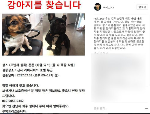 지난 2일 찬열은 인스타그램을 통해 '우선 갑작스럽게 이런 글을 올리게 된 점 양해를 구한다'면서 '정말 친한 형의 강아지 '참스'와 '튼튼이'가 실종됐다'고 적었다.
