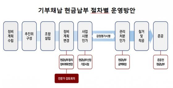 현금 기부채납은 정비계획에서 정한 전체 기부면적의 50%까지 정비계획 변경을 통해 적용할 수 있으며, 서울시 기부채납 통합관리부서에서 주관하는 현금 기부채납 전문가 검토회의를 거쳐 도시계획위원회 또는 도시재정비위원회 의결을 통해 최종 결정된다.
