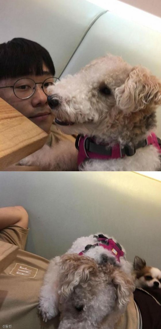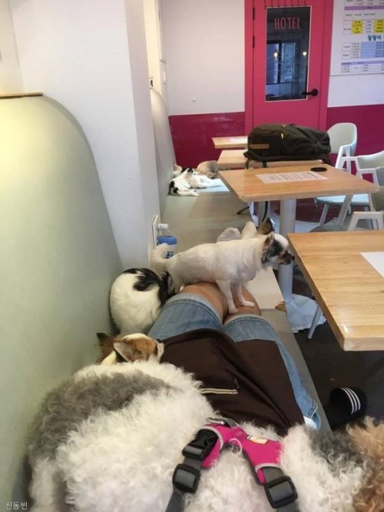 동빈 씨는 손님이 없을 때 잠시 쇼파에 기대 개들과 한 몸(?)이 되는 걸 좋아한다. 강아지들과의 셀카도 빠질 수 없다.