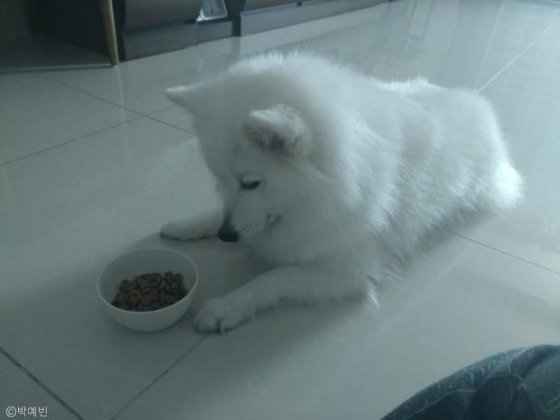 먹을 것 앞에서만 '모범견'이 된다는 또띠는 사료통이 눈 앞에 있어야만 "기다려", "앉아" 등이 통한다고.