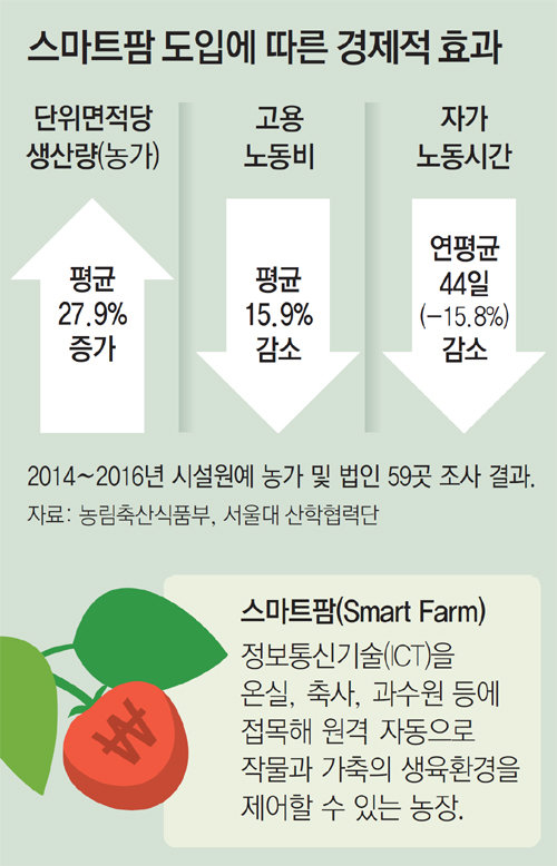 스마트팜은 노동력을 적게 들이면서도 농산물의 품질을 높이고 수확량을 늘리는 효과가 있다. 농식품부가 서울대에 의뢰한 ‘2016 스마트팜 성과 분석’에 따르면 스마트온실을 도입한 농가 55곳은 시설 설치 후 단위면적당 생산량이 평균 27.9% 늘었다. 스마트온실 도입 농가와 법인 59곳의 고용노동비는 평균 15.9% 줄었다. 특히 농장주의 연간 노동시간이 평균 44시간(15.8%) 감소했다.