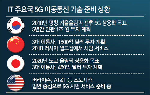 일본 총무성은 2020년 도쿄 올림픽 개최에 맞춰 5G 상용화를 목표로 올해 도쿄 도심에서 5G 시범망을 운영할 예정이다. 미국은 버라이즌이 소도시 11곳에서 5G 사전 테스트를 개시했고 AT&T도 일부 법인을 대상으로 시범 서비스를 시작한다고 밝혔다.