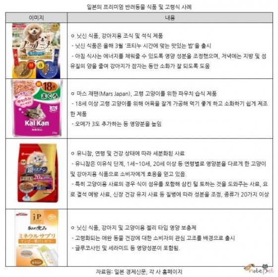 지난해 일본에서 강아지용 프리미엄 사료시장은 전년대비 2% 성장한 반면 중저가 사료 시장은 3% 감소한 것으로 나타났다. 고양이 사료시장 역시 프리미엄 제품은 3% 늘어났으나 중저가 시장은 줄어든 것으로 조사됐다.