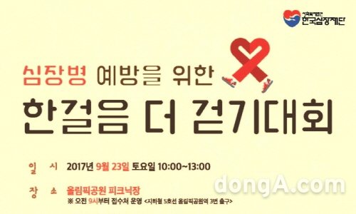한국심장재단은 지난 8월 7일부터 재단 홈페이지에서 ‘2017 한걸음 더 걷기대회’ 사전 접수를 받고 있다. 참가비는 무료이며 선착순 참가자 1000명에게 기념품과 간식이 제공된다.