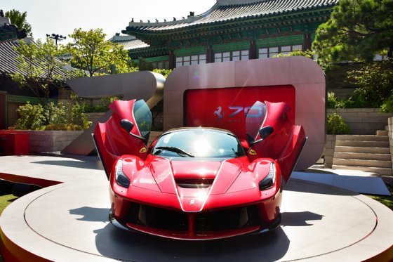 페라리는 18일 창립 70주년을 기념해 신라호텔 영빈관에서 축하 행사를 열고, 특별 한정 모델 ‘라페라리 아페르타’(LaFerrari Aperta·경매가 110억원)를 국내 최초로 공개했다.