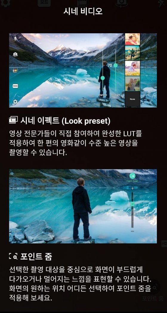특정 지점을 자연스럽게 확대할 수 있는 '포인트줌'과 가장자리를 어둡게 해 중앙으로 시선을 집중시키는 '비네트' 효과도 영상 촬영의 재미를 더해준다.특정 지점을 자연스럽게 확대할 수 있는 ‘포인트줌’과 가장자리를 어둡게 해 중앙으로 시선을 집중시키는 ‘비네트’ 효과도 영상 촬영의 재미를 더해준다.