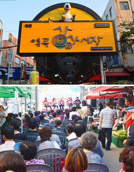 ‘만화의 도시’ 부천에 있는 역곡상상시장은 백곰을 캐릭터화한 ‘빼꼼’(위쪽 사진)을 시장 출입구에 조형물로 설치했다. 이 시장은 각종 문화공연(아래쪽 사진)도 열며 지역의 문화관광 공간 역할도 하고 있다. 부천 역곡상상시장 제공이곳은 아케이드를 설치한 덕분에 눈이나 비를 맞지 않아도 된다. 고객이 걸어 다니는 골목의 폭은 4m에 이른다. 대형마트에서나 볼 수 있는 카트는 물론 한 손에는 아이 손을 잡고, 다른 손으로 유모차를 미는 주부도 눈에 띄었다.