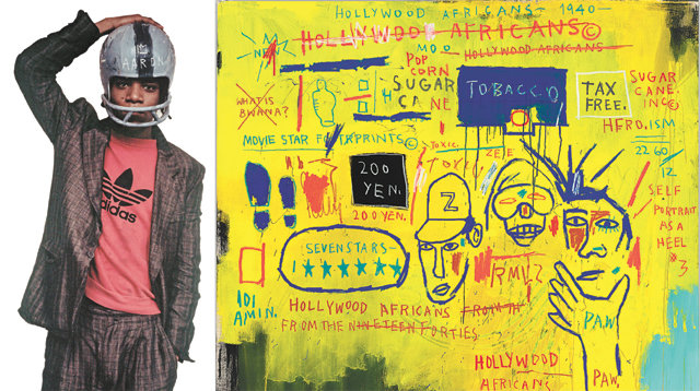 흑인 야구 영웅 ‘행크 에런’의 이름 위에 왕관을 그려 넣은 헬멧을 쓰고 있는 장미셸 바스키아(왼쪽 사진). 1970년대 후반 사우스브롱크스 할렘의 클럽에서 힙합 음악을 틀었던 바스키아는 동료 음악가 람엘지와 그라피티 아티스트 톡식의 얼굴을 ‘할리우드 아프리칸스’(1983년·오른쪽 사진)에 그렸다. 좌측 사람 모양 형상은 흑인 최초로 오스카상을 수상한 해티 맥대니얼을 상징한다. 바비컨 아트 갤러리 제공·ⓒThe Estate of Jean-Michel Basquiat, Licensed by Artestar, New York1960년 미국 뉴욕 브루클린에서 태어난 그라피티 화가 바스키아는 28세로 요절하기까지 ‘낙서를 예술의 경지로 이끈 예술가’ ‘블랙 피카소’란 상찬을 받았다. 약물 복용으로 짧은 생을 마감한지라 작품 수가 적은 데다 대부분 개인 수집가가 소장해 경매에서나 작품을 볼 수 있었다. 런던에서 첫 회고전이 열리기까지 20여 년이나 걸린 이유다. 이 때문에 지난해 9월 시작한 전시는 바비컨 역사상 가장 많은 관객이 찾았다고 한다.