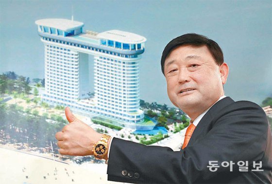 엄지손을 치켜들고 있다. 심 회장은 인터뷰 내내 강릉 경포대에 위치한 호텔을 지역 랜드마크로 키워 보겠다는 욕심을 감추지 않았다.
