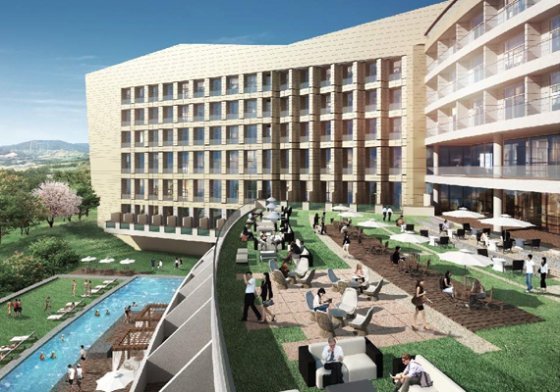 라마다 평창 호텔&스위트 조감도.대지 3만6296m², 연면적 5만1649m², 지하 3층∼지상 4층의 초대형 규모로 지어지는 라마다 평창 호텔&스위트는 넉넉한 공간을 갖춘 복층형 객실 644실, 테라스 풀빌라 34실 등 총 678실로 이뤄져 있다.