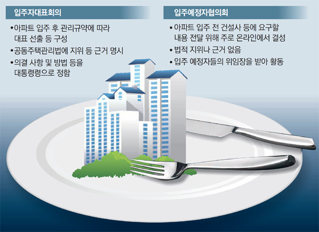 입주 이후 공동주택관리법에 따라 구성되는 입주자대표회의와 달리 입예협은 법적 근거가 없다. 이로 인해 내부 갈등으로 집행부가 자주 바뀌거나 운영이 파행을 겪기도 한다. 하자보수 소송 전문 브로커 등과 연계해 입예협을 악용하는 사례도 있다. 입주 전에 분양권을 팔고 새 분양권을 사들이는 방식으로 단지를 바꿔가며 여러 곳에서 입예협 간부로 활동하며 이득을 챙기는 방식이다. 한 건설사 관계자는 “입주 예정자들의 권리를 지키는 긍정적 기능도 있지만 그에 못지않은 부작용도 있는 것 같다”고 했다.