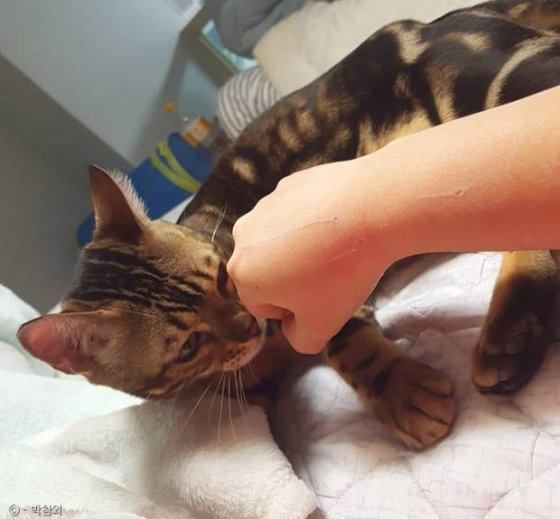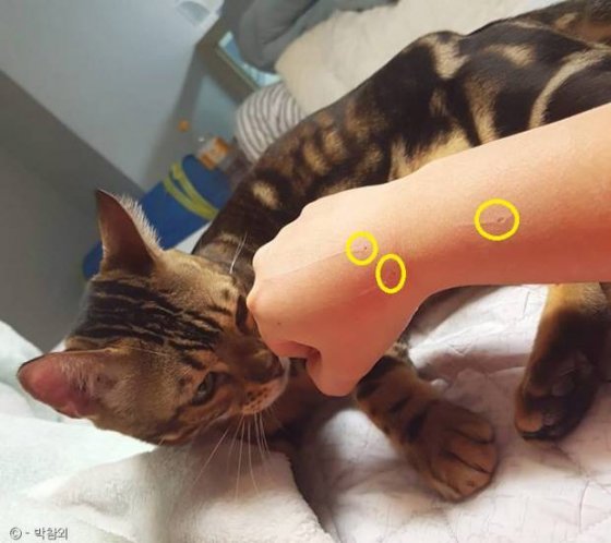 참외 씨가 요새 그런 감정을 느끼고 있다. 이제 1살이 된 벵갈믹스 고양이 겸이. 지난 11일 일요일 오전의 한가로움의 즐기던 중 참외 씨의 팔에 구멍을 냈다. 그것도 세 개다.