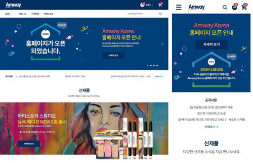 한국암웨이 신규 홈페이지 웹(왼쪽) · 모바일 버전.간편 회원 가입, 지문 인증 로그인 등 사용자 편의 증대에 초점