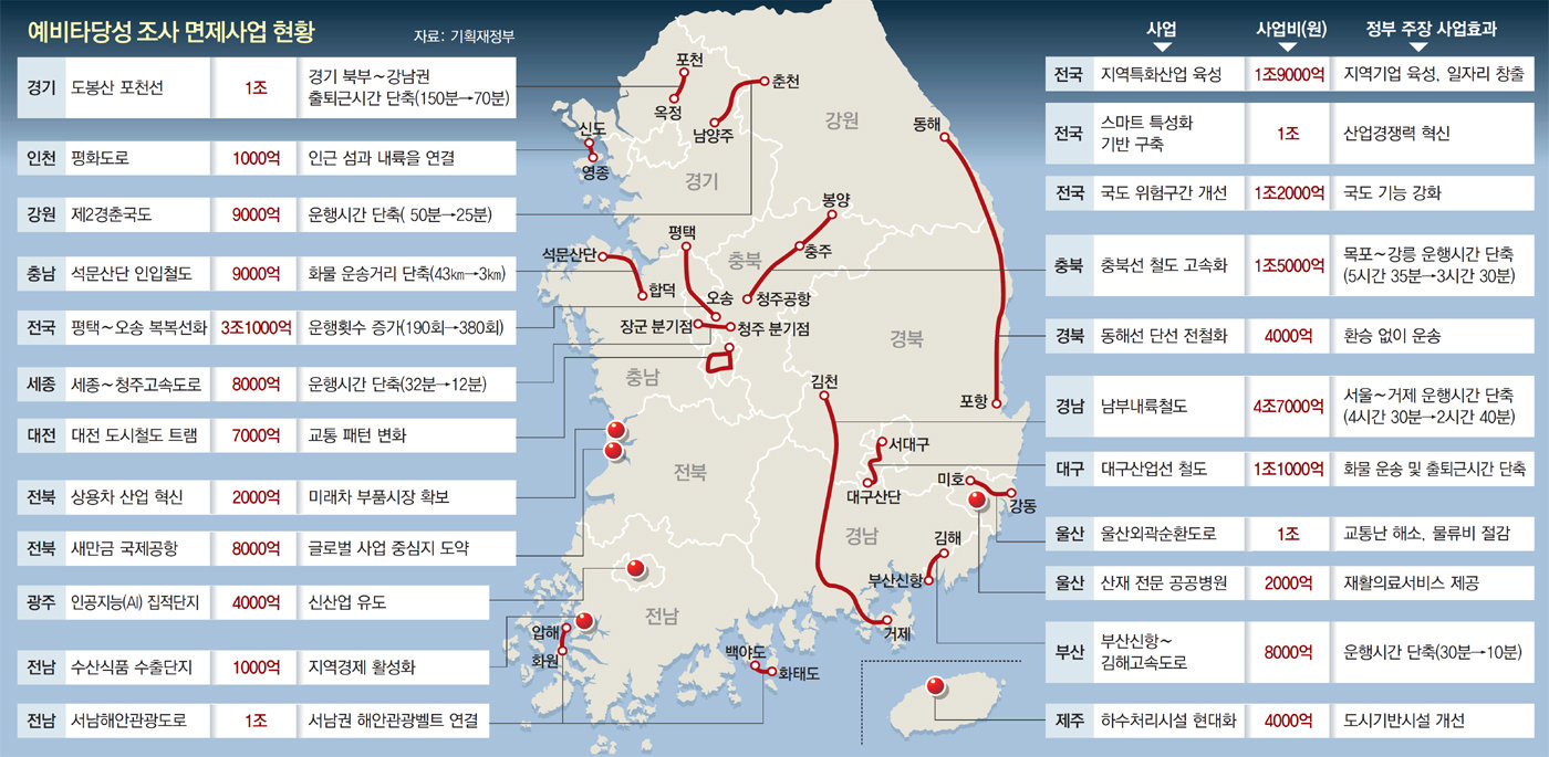 이번 예타 면제 대상에는 각 지역의 숙원사업이나 지자체장의 핵심 공약이 대거 포함됐다. 경북 김천에서 경남 거제를 잇는 172km 구간에 고속철도를 놓는 남부내륙철도 사업이 대표적이다. 사업비가 총 4조7000억 원에 이른다. 정부는 이 노선이 완공되면 서울에서 거제까지 현재 4시간 반에서 2시간 40분대로 이동 시간이 단축될 것으로 보고 있다.