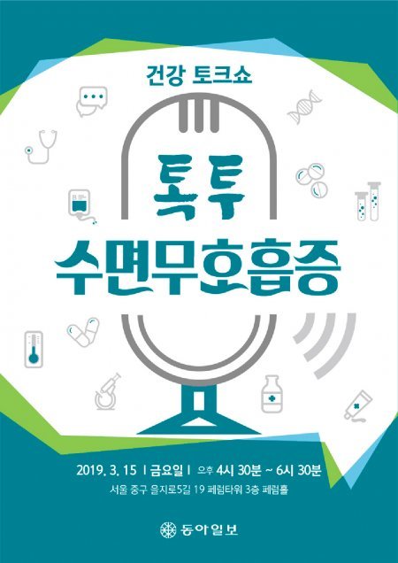 동아일보 건강 토크쇼 ‘톡투 수면무호흡증’이 3월 15일 서울 중구 ‘페럼타워’에서 열린다. 이날 행사에는 단국대 의대 신경과 김지현 교수(대한수면학회 홍보이사·대한수면연구학회 학술이사)와 코슬립수면의원 신홍범 원장(대한수면의학회 보험이사)이 연사로 나선다. 방송인 샘 해밍턴도 참여해 수면무호흡증 검사와 치료를 받은 경험을 공유한다. 행사에는 누구나 참석할 수 있다. 다만 전화와 온라인으로 사전에 참가 등록을 해야 한다. 선착순 150명까지 받으며 입장료는 없다. 현장 참석자에게는 소정의 기념품을 제공한다.