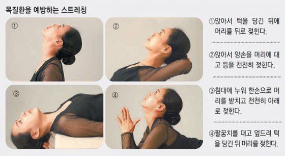 마지막으로 엎드려서 목을 젖힌다. 팔꿈치를 대고 엎드려 턱을 당긴 뒤 머리를 젖힌다. 이때도 목 부위에 통증을 느끼면 중지한다. 10번 반복하고 마지막엔 10초를 유지한다. 이 네 가지 방법 중 본인이 현재 상태에서 할 수 있는 스트레칭 방법을 선택해 매일 꾸준히 하는 게 중요하다.