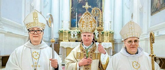 이탈리아 시에나의 몬테 올리베토 대수도원 총원에서 올해 3월 열린 유덕현 아빠스(왼쪽) 축복 예식. 가운데가 디에고 마리아 로사 총아빠스다. 고성수도원 제공“우리는 다람쥐 쳇바퀴 돌듯 삽니다. 매일 하느님께 의탁하고, 정성을 다해 기도하고 묵상하고, 형제를 사랑합니다. 우리의 소박한 삶이 하느님이 있다는 것을 알려주는 증거가 됩니다.”