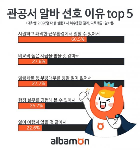 아르바이트 대표 포털 알바몬(대표 윤병준)이 최근 대학생 2026명을 대상으로 관공서 알바 선호도 조사를 실시하고 그 결과를 발표했다.