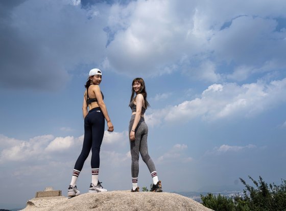 양말의 존재감이 커지면서 발목을 넘어 무릎까지 오는 반양말도 덩달아 인기다. 산 정상을 배경으로 다양한 색감의 레깅스에 반양말을 최대한 끌어올려 신은 젊은 여성의 인증 사진이 인스타그램에 넘친다. 산보나 간단한 운동에 나설 때 다른 건 포기해도 양말은 무조건 크고 묵직하게 보이도록 스타일링 하는 것이 트렌드의 핵심이다.
