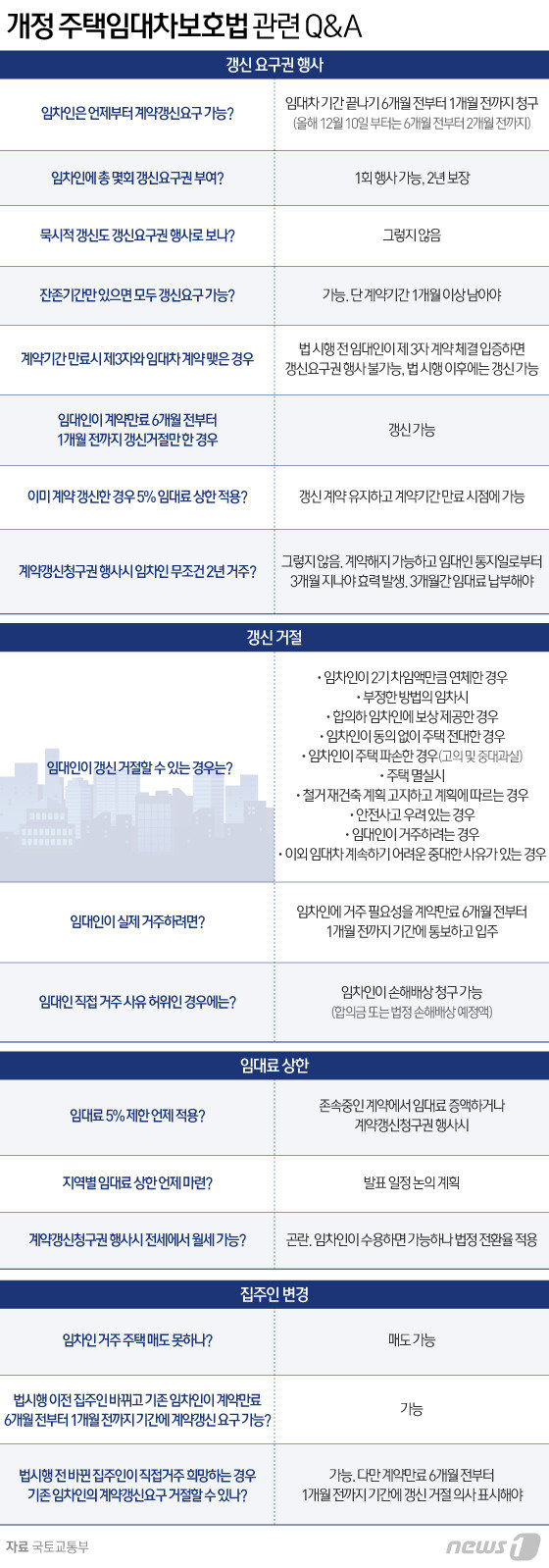© News1 국토교통부와 법무부는 계약갱신청구권 등 이달 도입한 임대차3법의 이해도를 높이기 위해 28일 ‘주택임대차보호법’에 대한 해설집을 발표했다. <뉴스1>은 임대차3법 개정 후 가장 문의가 많았던 13가지 질문에 대한 답변을 추려 정리했다.