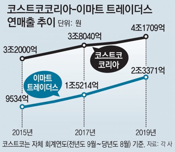 매출은 아직 코스트코가 1조 원 이상 앞서지만 최근 5년간 성장률은 트레이더스(212%)가 코스트코(45%)를 훨씬 앞선다. 경쟁이 격화되면서 두 업체는 상대 회사의 매장과 멀지 않은 곳에 점포를 내는 맞불 전략을 서슴지 않고 있다. 코스트코는 2015년 트레이더스 용인 구성점에서 자동차로 20분 거리에 용인 공세점을 열고, 지난해에는 트레이더스 하남점에서 15분 거리에 코스트코 하남점을 열었다. 트레이더스도 코스트코 일산점 인근에 킨텍스점을, 코스트코 상봉점과 멀지 않은 거리에 월계점을 출점했다.