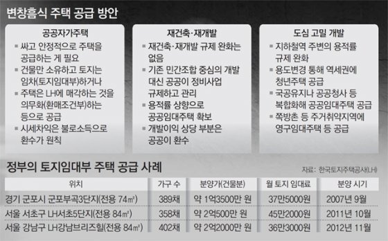 하지만 공공자가주택의 양대 방식인 토지임대부(토지는 공공이, 주택은 개인이 소유)나 환매조건부(분양주택 매각 시 LH 등 공공에 주택을 되팔도록 제한) 방식은 시장에서 정책목표를 달성하지 못했다는 평가다. 2007년 경기 군포 부곡지구에서 약 400채가 분양된 환매조건부 주택의 경우 미분양이나 계약 해지 등으로 모두 일반분양으로 전환된 상태다. 2009년 분양을 시작한 토지임대부 방식 보금자리주택은 도입 당시엔 인근 주택 수요를 흡수해 일부 가격 안정 효과를 봤다는 평가를 받았지만, 지금은 또 다른 ‘로또 아파트’가 됐다. 2011년 2억500만 원에 분양된 서울 서초구 LH서초5단지의 토지임대부 주택은 전용 84m² 호가가 12억∼13억 원에 이른다.