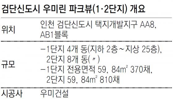 22일 우미건설에 따르면 검단신도시 우미린 파크뷰는 2개 단지로, 인천 검단신도시 택지개발지구 AA8와 AB1블록에 각각 들어선다. 1단지는 4개 동(지하 2층∼지상 25층) 370채다. 전용면적 59m²는 257채, 84m²는 113채다. 2단지는 8개 동(지하 2층∼지상 25층)이며 전용면적 59m² 545채, 84m² 265채 등 810채 모두 분양으로 공급된다. 검단신도시에서 드문 전용면적 59m² 물량이 특히 많다.