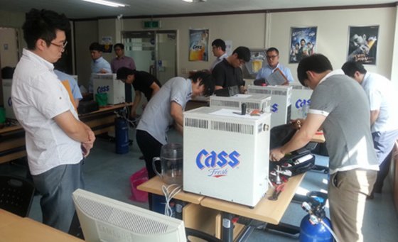 생맥주 기기 관리업체인 ‘키노콘’ 직원들이 회사 내 생맥주관리사 자격시험을 치르고 있다. 키노콘은 사내 자격제도로 생맥주 관리의 전문성을 높이고 있다. 고용노동부 제공같은 생맥주를 파는 가게라도 맥주가 맛있는 가게가 있고, 물을 탄 듯 맛이 없는 가게가 있다. 생맥주의 맛은 적절한 온도와 압력, 장비의 청결도 등 조그만 환경의 변화에도 크게 달라지기 때문이다.