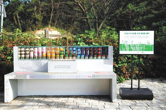 천리포 수목원에 설치한 업사이클 벤치. 아모레퍼시픽 제공아모레퍼시픽은 화장품 용기가 초래하는 환경 문제에 공감하며 불필요한 플라스틱 소비를 줄여 나가고 있다.