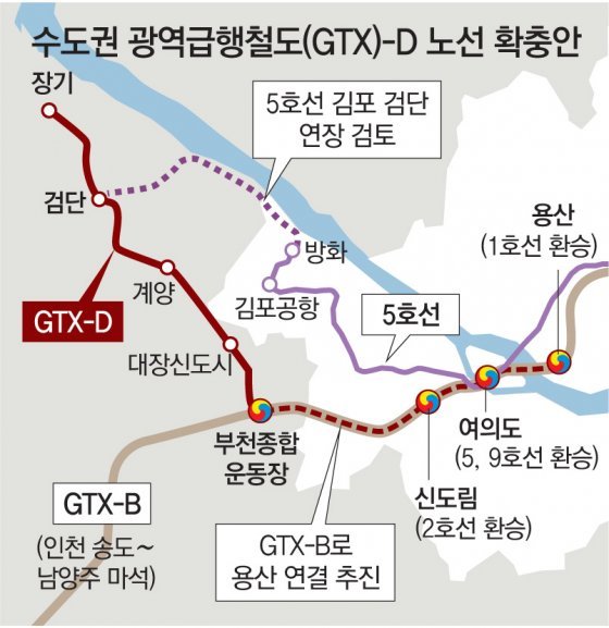 수도권광역급행철도(GTX)-D 노선을 서울 강남과 직접 연결해 달라는 지역 주민의 요구를 정부가 받아들이지 않았다. 그 대신 GTX-B 선로를 이용해 GTX-D 열차를 서울 용산과 연결하고, 서울 지하철 5호선을 인천 검단까지 연장하는 방안을 검토하기로 했다.
