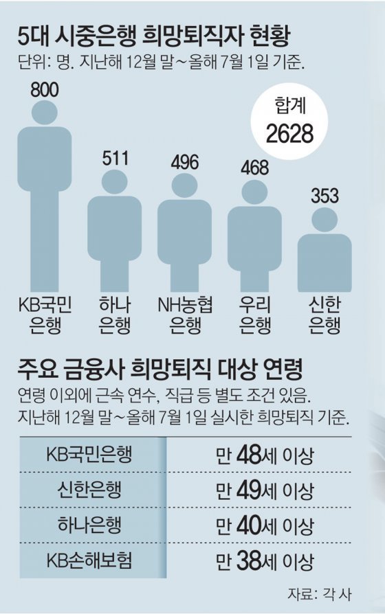 2일 금융권에 따르면 지난해 말부터 올해 6월 말까지 KB국민, 신한, 하나, 우리, NH농협 등 5대 시중은행에서 희망퇴직으로 은행을 떠난 직원은 총 2628명으로 집계됐다.
