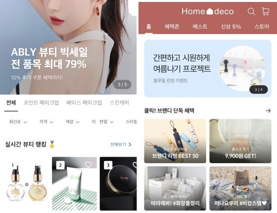 패션 플랫폼 에이블리의 뷰티 제품 판매 화면(왼쪽 사진)과 브랜디의 리빙 제품 판매 화면. 각 사 제공