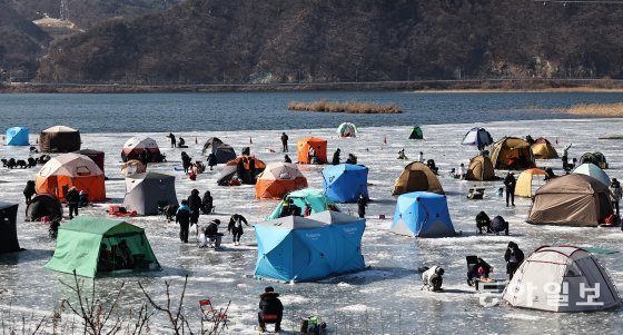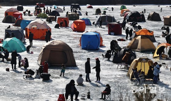 강추위가 계속되고 있는 가운데 6일 강원 춘천시 의암호를 찾은 시민들이 얼음 위에서 빙어 낚시를 하고 있다. 빙어 낚시터로 잘 알려진 이곳에는 아이스텐트를 설치한 뒤 바닥에 구멍을 뚫고 이른바 ‘텐트빙어낚시’를 하는 사람들이 매년 겨울 몰려든다. 춘천=양회성 기자 yohan@donga.com2월의 첫 주말인 6일 강원 춘천 의암호가 만들어낸 빙판 위에는 알록달록 가지각색의 텐트들이 모여 있었다. 두껍게 얼어붙은 춘천의 빙판은 입춘 소식에도 아직 녹을 생각이 없는 듯 구멍을 뚫으려는 사람들과의 버티기가 계속 됐다.