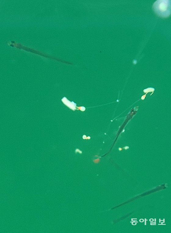 구더기를 끼운 찌에 몰려드는 빙어떼.