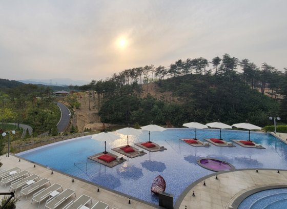 ‘설악산과 동해를 품은 정원’으로 불리는 강원 양양군 설해원의 야외 온천 수영장.단풍으로 유명한 양양의 설악산 오색(五色)지구는 ‘하늘 아래 온천 1번지’로 불릴 정도로 약수와 온천이 유명하다. 오색은 주전골의 암반이 다섯 가지 빛을 발하고, 봄이면 다섯 가지 색의 꽃이 피는 나무가 있다 하여 붙여진 지명이다.