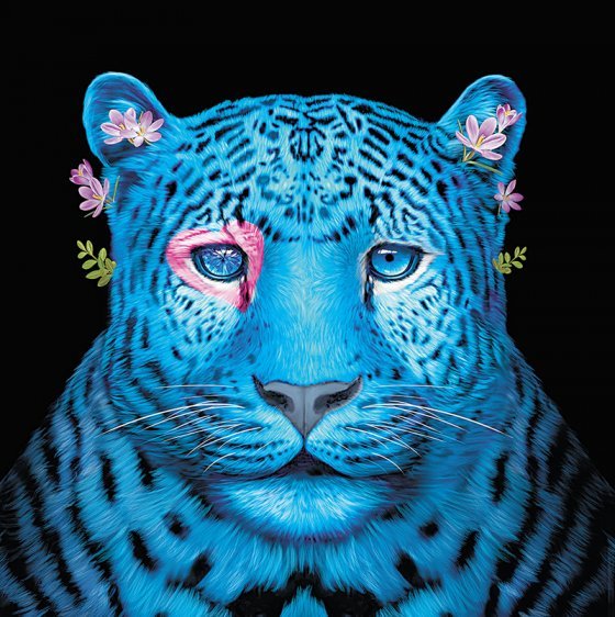 고상우 작가가 아프리카 표범을 그린 디지털회화 작품 ‘레오(LEO)’. 왼쪽 눈을 다이아몬드로 표현했다. 사비나미술관 제공아프리카 사바나 어딘가를 달릴 것 같은 표범. 그 표범이 정면을 응시한 채 눈을 맞추고 있다. 그 영롱한 눈은 무얼 말하고 싶은 걸까.