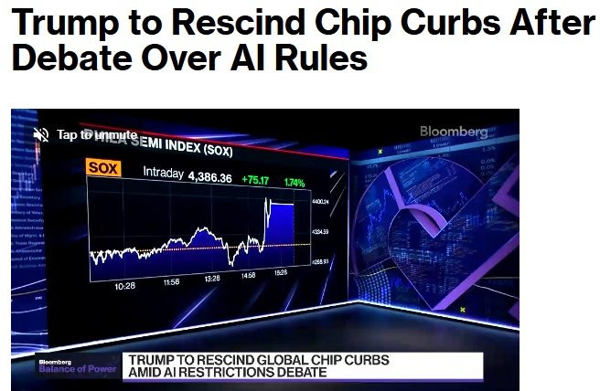 해당 기사 - 블룸버그 갈무리미국의 블룸버그통신이 트럼프 행정부가 인공지능(AI) 전용칩 수출 제한을 철회하는 방안을 모색하고 있다고 보도함에 따라 엔비디아가 3% 이상 급등하는 등 미국의 반도체주가 일제히 랠리, 삼성전자 등 한국의 반도체 업체에도 숨통이 트일 전망이다.