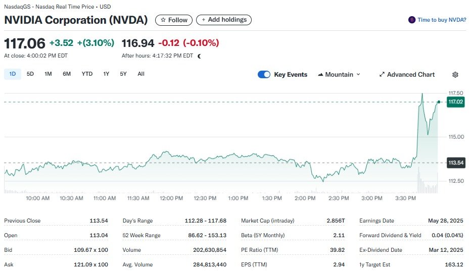 엔비디아 일일 주가추이 - 야후 파이낸스 갈무리이는 일단 전일 젠슨 황 엔비디아 최고경영자(CEO)가 대중 AI 칩 수출을 제한하면 화웨이만 이득을 볼 것이라고 경고했기 때문으로 풀이된다.