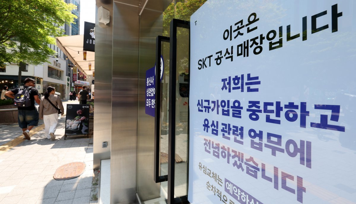 12일 오후 서울 시내 T월드 매장 앞에 유심 교체 및 유심보호서비스 안내문이 게시돼 있다.