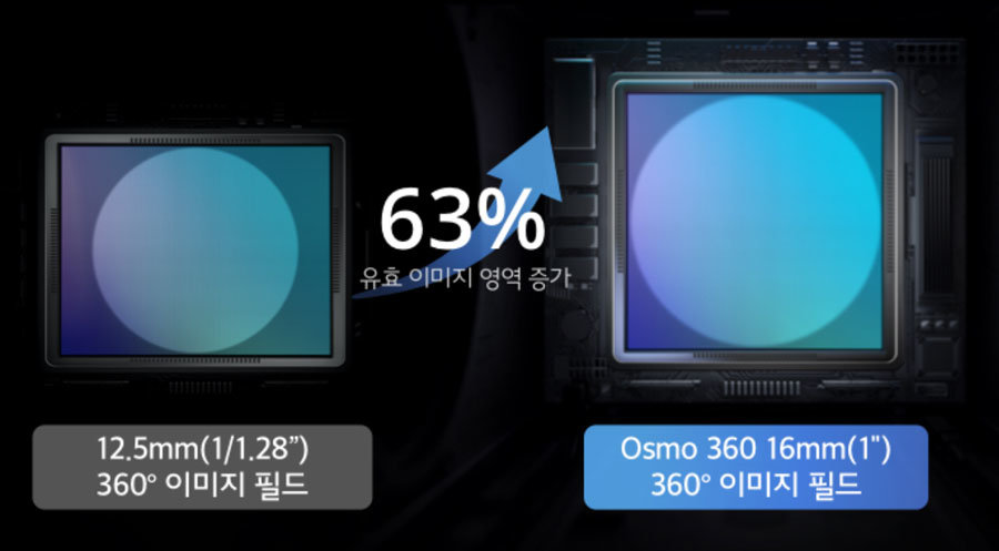 직사각형 센서(왼쪽)를 이용하는 기존 제품과 달리 오즈모 360은 360도 촬영에 최적화된 정사각형의 1인치 센서(오른쪽)를 적용했다 / 출처=DJIDJI는 이 문제를 해결하기 위해 오즈모 360에 업계 최초로 1인치(16mm) 크기의 정사각형 센서를 적용했다. 이를 통해 센서 활용률이 기존 대비 25% 향상되었으며, 동일한 1인치 이미지 필드를 유지하면서도 카메라 크기를 줄이고 에너지 효율성을 높일 수 있었다고 강조한다.